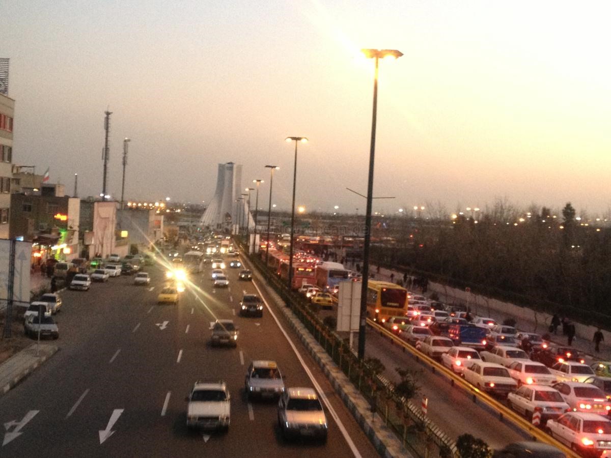 Im Zentrum empfängt mich wie nahezu überall im Inneren der iranischen Hauptstadt Verkehrschaos. Allgegenwärtig: lautstarkes Hupen, sich durch die Blechlawine hindurchschlängelnde Möfs und Motorräder, auf Schutzengel vertrauende völlig schmerzbefreit Straßen kreuzende Fußgänger und hier und da ein Crash. Aber das alles ist ein Scheiß verglichen mit den Zuständen in Mumbai, soviel ist mal sicher. Bei näherem Hinsehen ist das vermeintliche Chaos gar nicht so ungeordnet und der Verkehr wesentlich flüssiger als es einem auf den ersten Blick vorkommt.